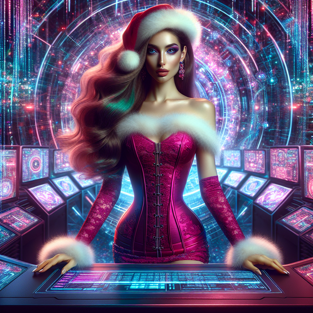 Full-body digital painting of a stunning Scottish woman with long flowing hair and flawless makeup. She wears a short tight hot pink sleeveless dress with white fluffy trim, paired with a Santa hat with white fur. She strikes a confident, mysterious pose at a futuristic hacker workstation surrounded by glowing neon lights, holographic computer screens, and colorful code, in a festive cyberpunk Christmas style.