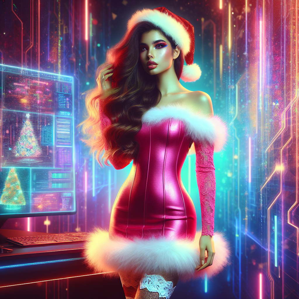 Full-body digital painting, beautiful woman, long flowing hair, striking makeup, short tight hot pink dress with white fluffy trim, Santa hat with white fur, confident mysterious pose, futuristic hacker workstation, glowing neon lights, holographic computer screens, colorful code, festive cyberpunk Christmas style