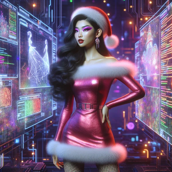 Full-body digital painting, stunning woman, long flowing hair, beautiful makeup, short tight hot pink dress with white fluffy trim, Santa hat with white fur, confident mysterious pose, futuristic hacker workstation, glowing neon lights, holographic computer screens, colorful code, festive cyberpunk Christmas style